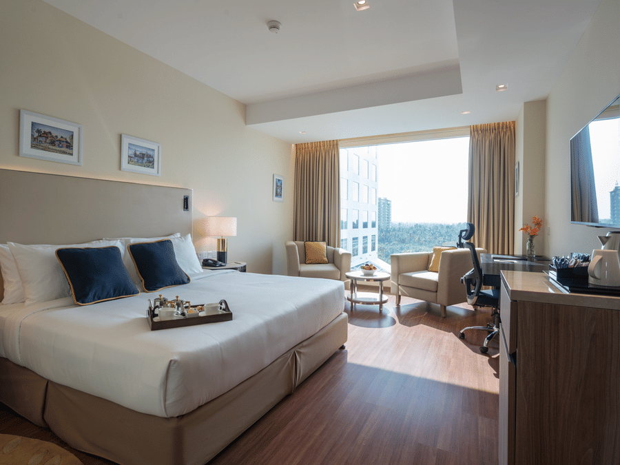 Our suites in Trivandrum offer 730 sq. ft. of thoughtfully designed space, ideal for up to three guests. With warm, calming interiors and a perfect balance of comfort and functionality, these suites create an inviting atmosphere for work or leisure. Featuring a separate living area and a private powder room, they are flexible enough for meetings or simply enjoying panoramic views. Modern essentials like high-speed Wi-Fi, a 43” smart LED TV, a stocked minibar, and an electronic safe make every stay effortless. Plan your Suite room booking and stay in Trivandrum with O by Tamara, and experience convenience like never before.